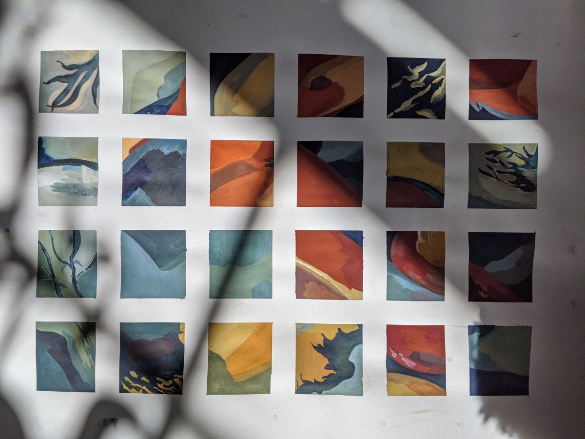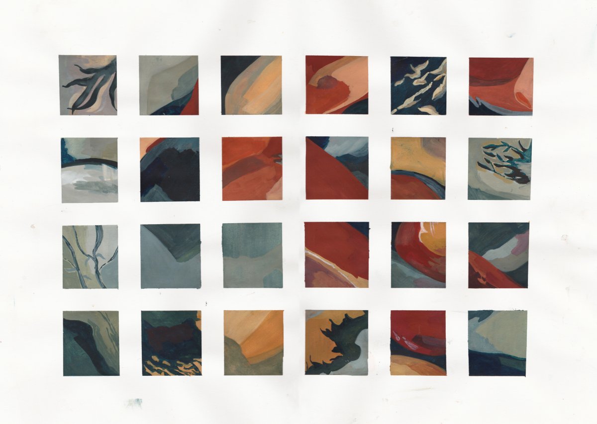 Using a blue and orange colour palette, I have create a series of abstract gouache paintings. I have tried to create a mood with the colours and shapes, although I think that this should be interpreted by the viewer. I tried to make each painting work in unison with the other colours around it, so overall the colours move through blue into orange and then back to blue again. I did this by painting each square chronologically, so the next one is response to the previous colour palette. I think this was fairly effective, however I think the colours could be more varied and vivid in the way that the paintings I have done previously are.