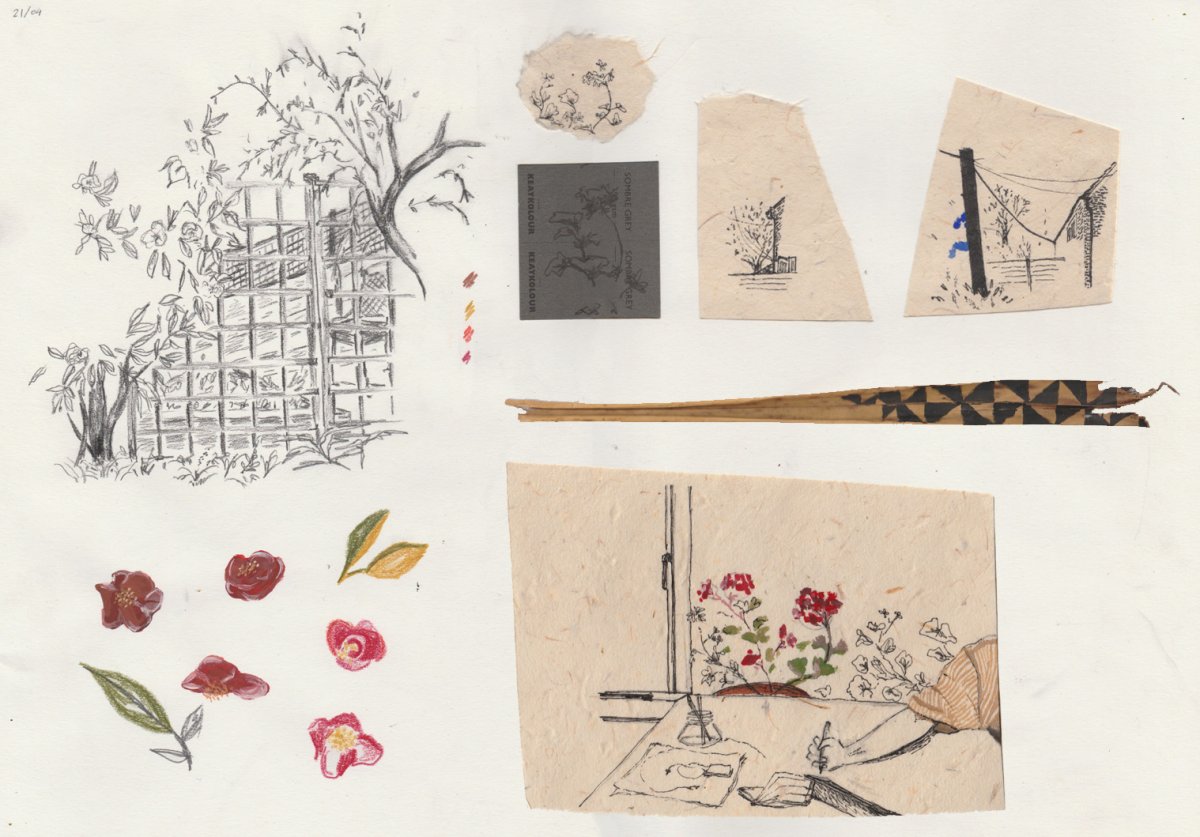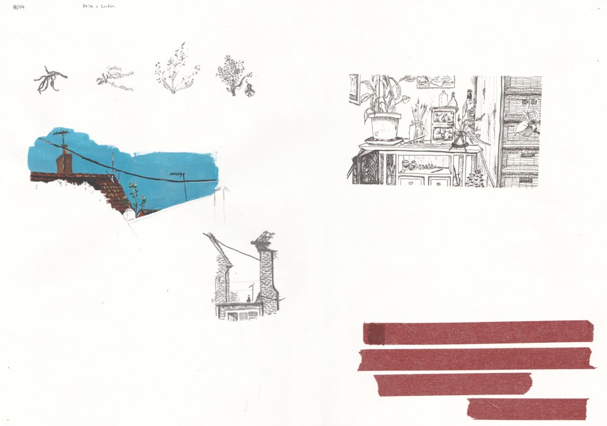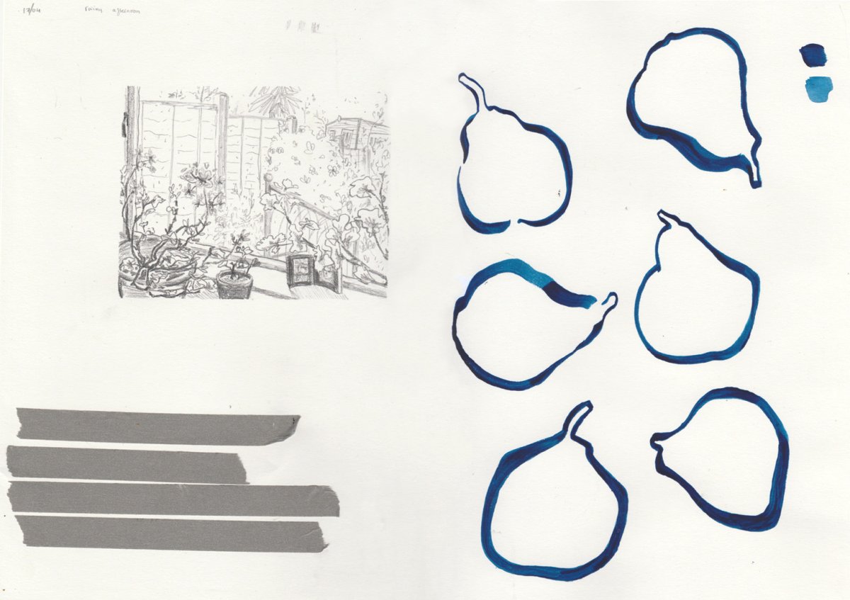 I found throughout the week that my workspace kept moving around and that I haven’t been able to settle in one place, however I kept coming back to drawing the space beyond my house – either out of windows or beyond fences. I particularly like the contrast in this sheet of the detailed drawing out of the window against the linear paintings of the pears from the fruit bowl. I think similarly to the initial sheet I did, the colours and the drawings in combination reflect the rainy weather and a sense of the space.