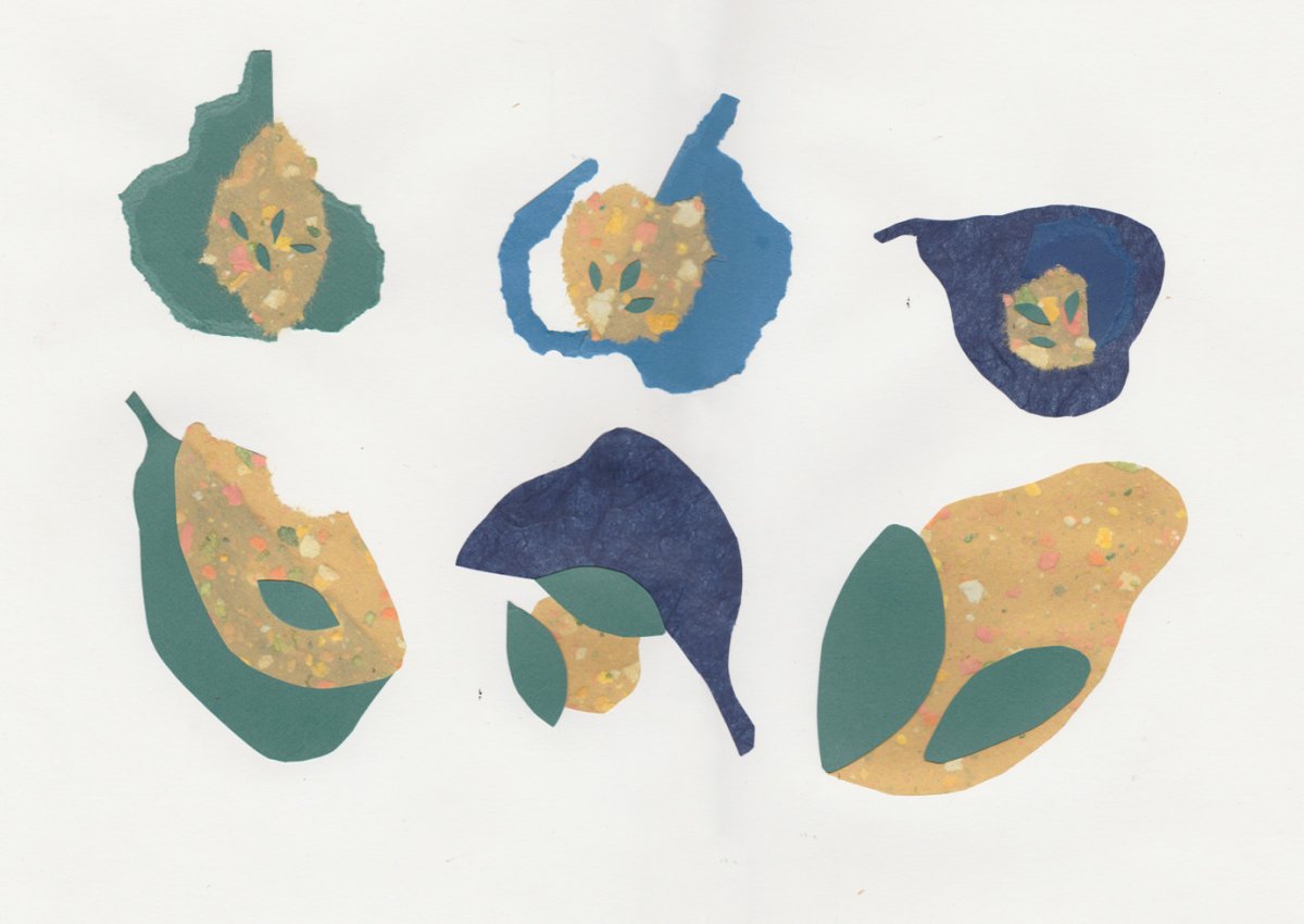 I decided to take the shapes of the pears and use them to create collaged pieces using scraps of handmade papers I found. These shapes became more and more abstracted, which I really like in contrast to the initial paintings I did.